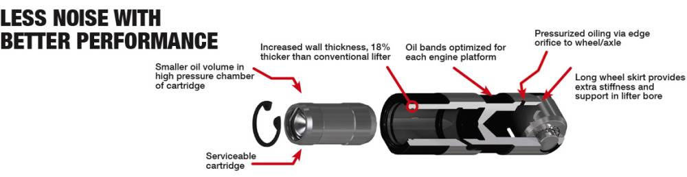 The cartridge design allows for an incredibly stiff lifter body that greatly reduces body distortion and further ensures consistent hydraulic performance.